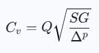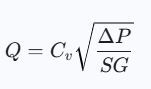 Where Cv is the valve flow coefficient, it is related to the type of valve being used, and SG is the specific gravity of water (which can be assumed to be 1). It measures the capacity of a valve to let fluid flow through it.